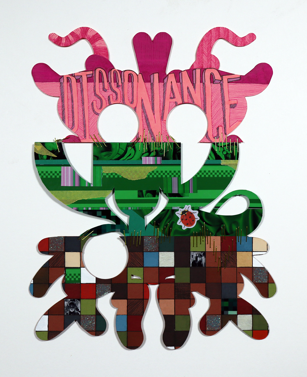 This scavenging, cutting, layering, overlapping, rearranging, decorating, and merging entail a process of making formal sense of seemingly unrelated parts. In turn, this results in a lineage of hybrid, glyph-like assemblages.