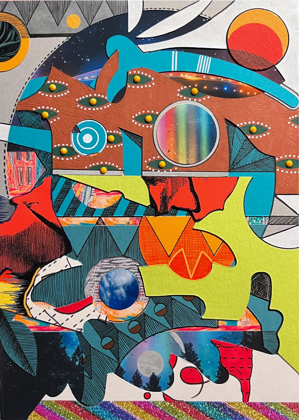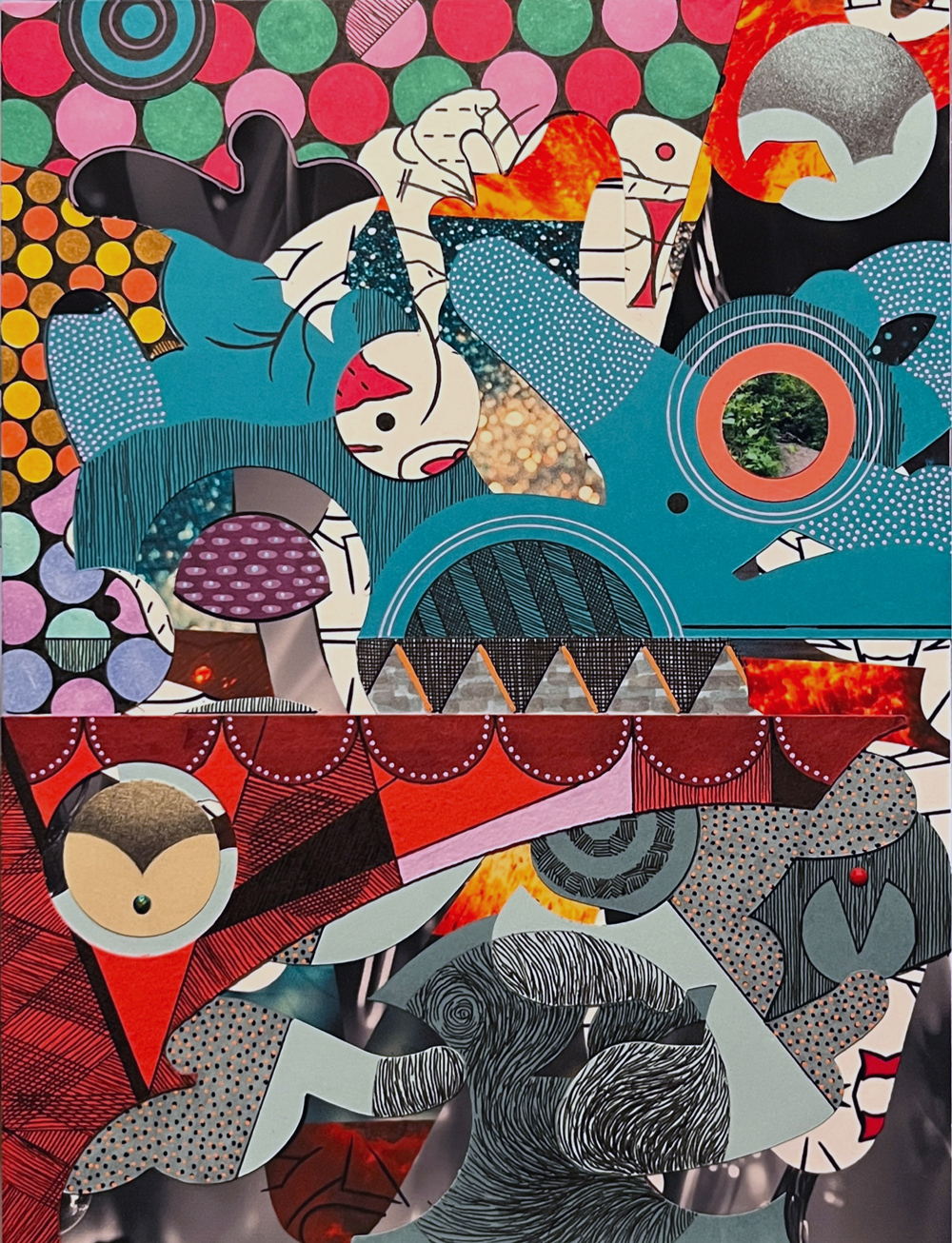 A Case of the Social Studies 8″x9″; paper, paint, vinyl, found images, staples, tape, ink; 2025