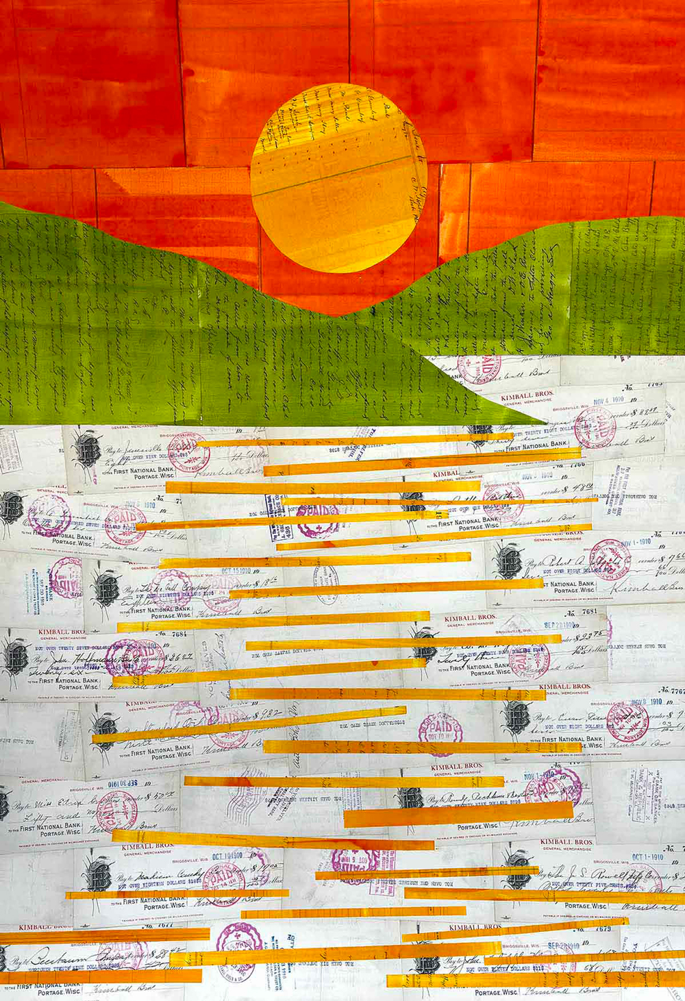 My large-scale collages are built from ledgers, letters, blueprints, lessons, and autograph books spanning the early 1800s through the mid-1900s. I collect these materials for what they hold: the narrative residue of ordinary lives, the handwritten and the printed, the intimate and the institutional. Through the act of collage, I fragment and reconfigure them into new compositions that ask what it means to preserve, to disrupt, and to remember.