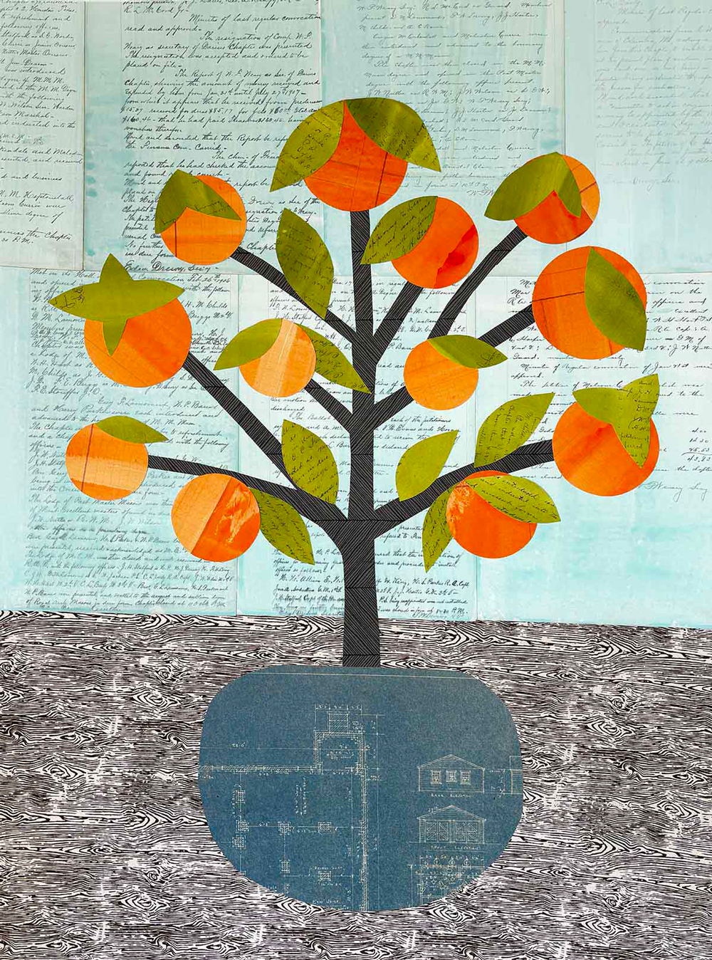 Krill maintains several ongoing bodies of work, among them the “Moving Still Lives Series,” the “Handwritten Seas Series,” and the “Orange Tree Series.” She also accepts private commissions incorporating genealogical and archival materials, creating collages that weave together a family’s documentary history into a single cohesive work. Notable commissions include Strong Roots, created for The Pittsburgh Foundation.