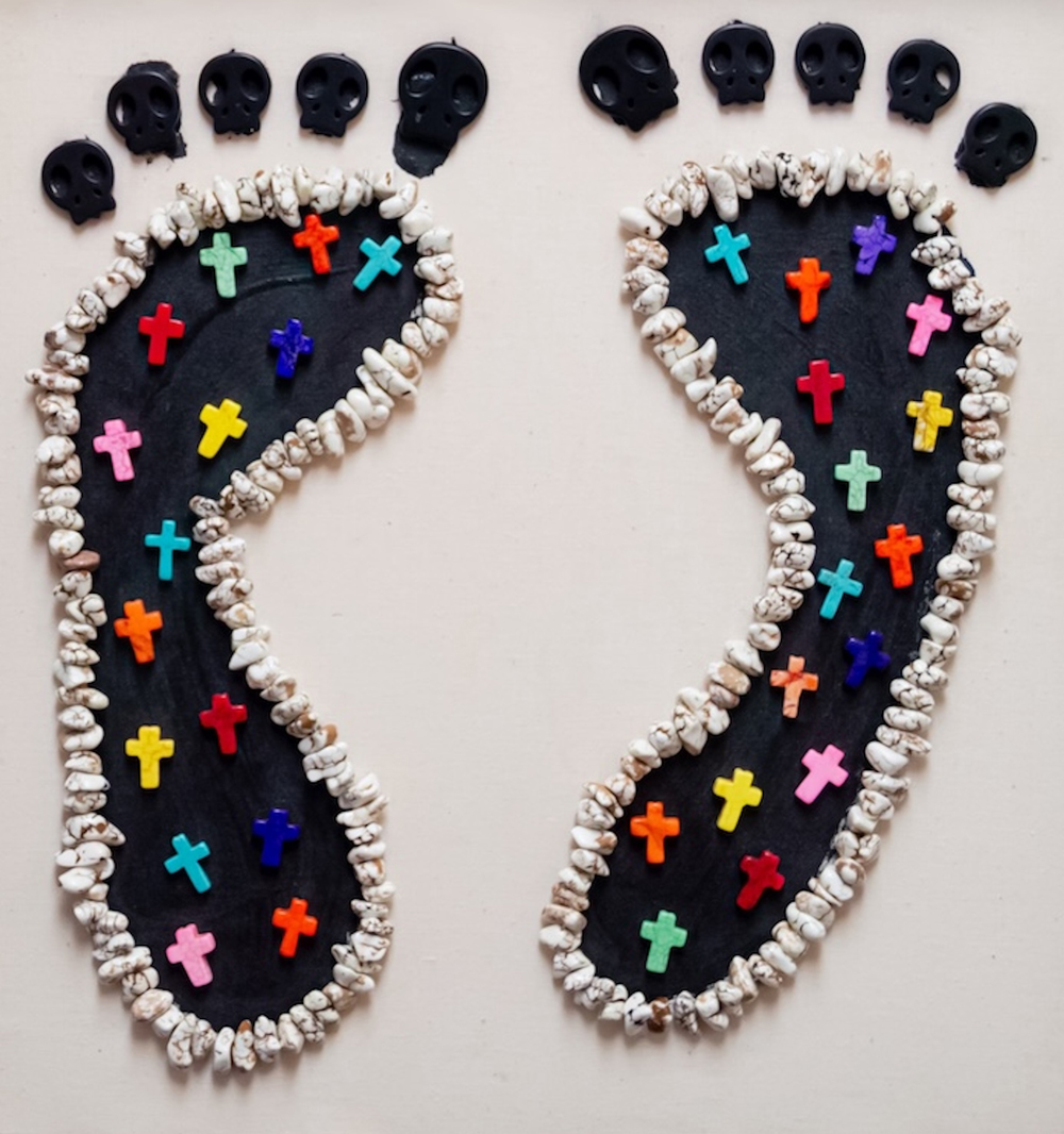 indoor house paint, beads, black skulls, colorful crosses, on sailcloth; 2012. Courtesy of the artist.