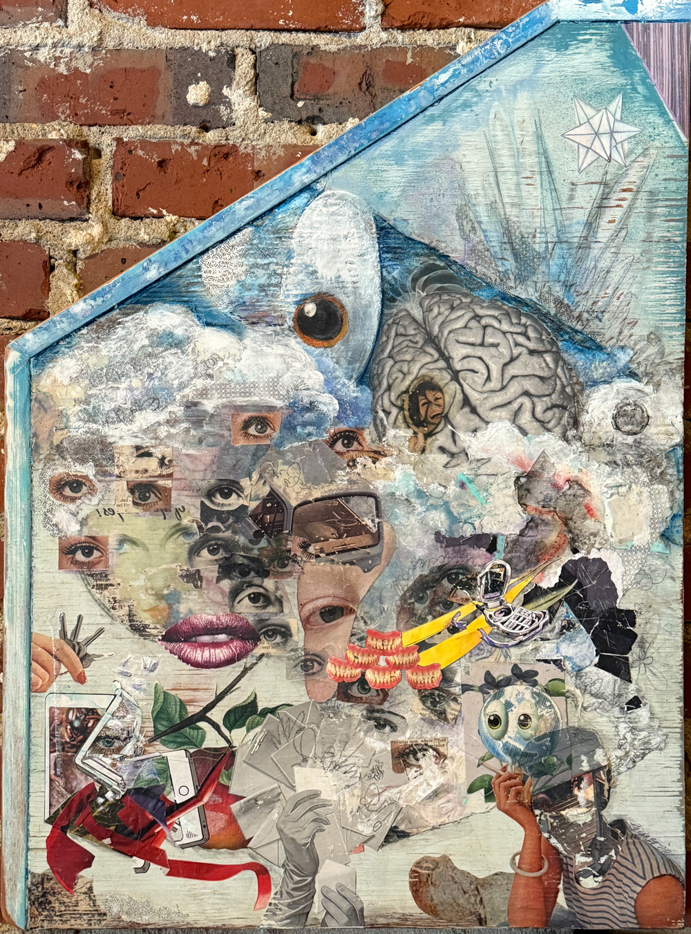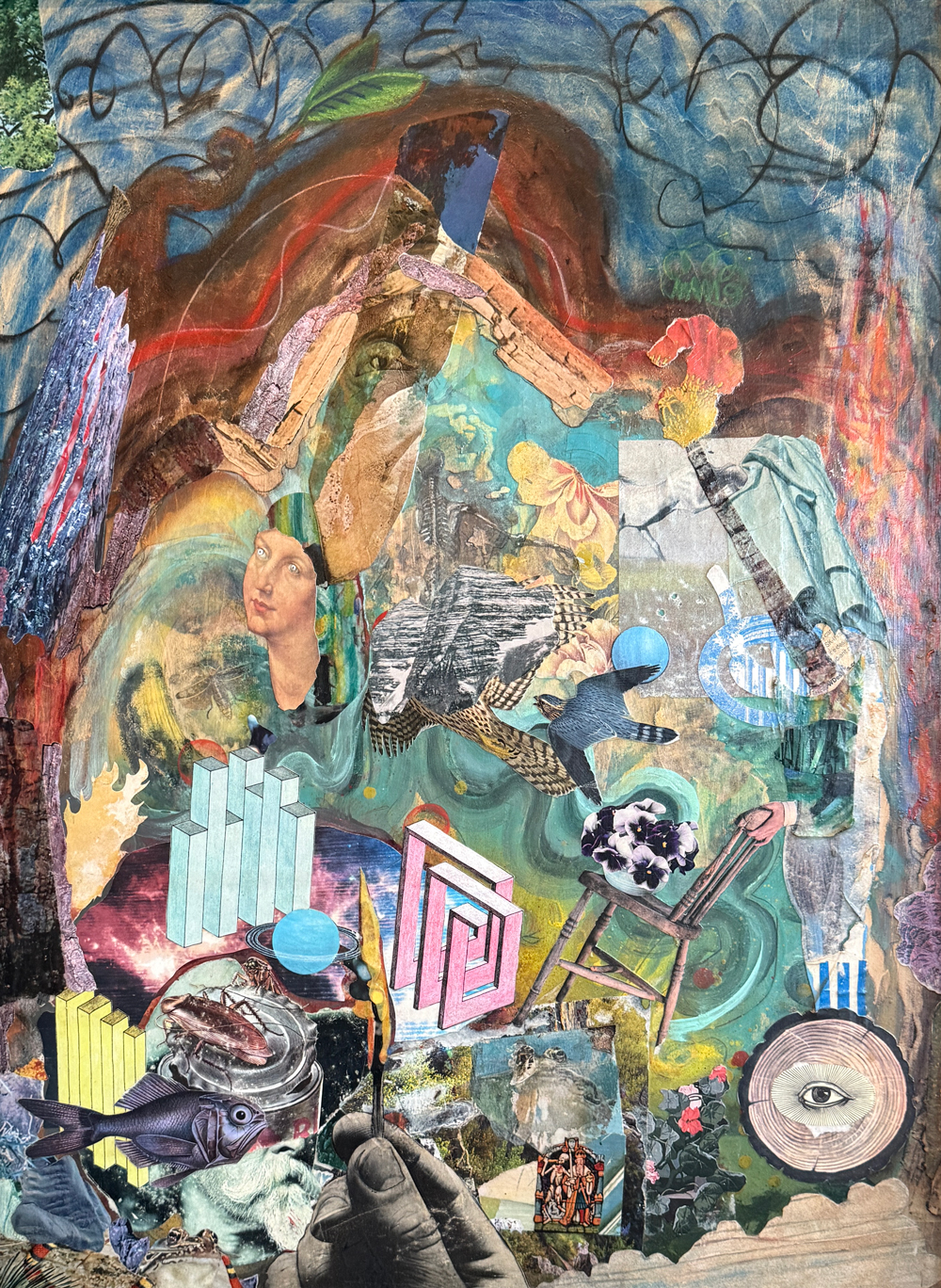 25.5″x18.5″; paint, collage, graphite, charcoal, ink, image transfer on wood; 2023. Courtesy of the artist.
