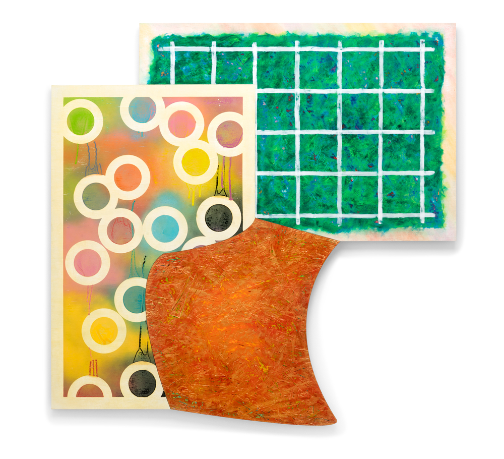 46″×46.5″; acrylic, alkyd spray paint, gesso, graphite, and shellac on MDO and OSB; 2025. Courtesy of the artist.