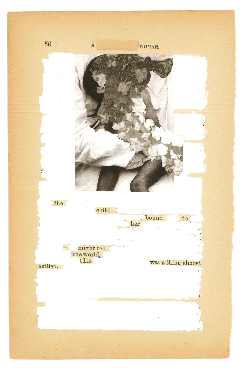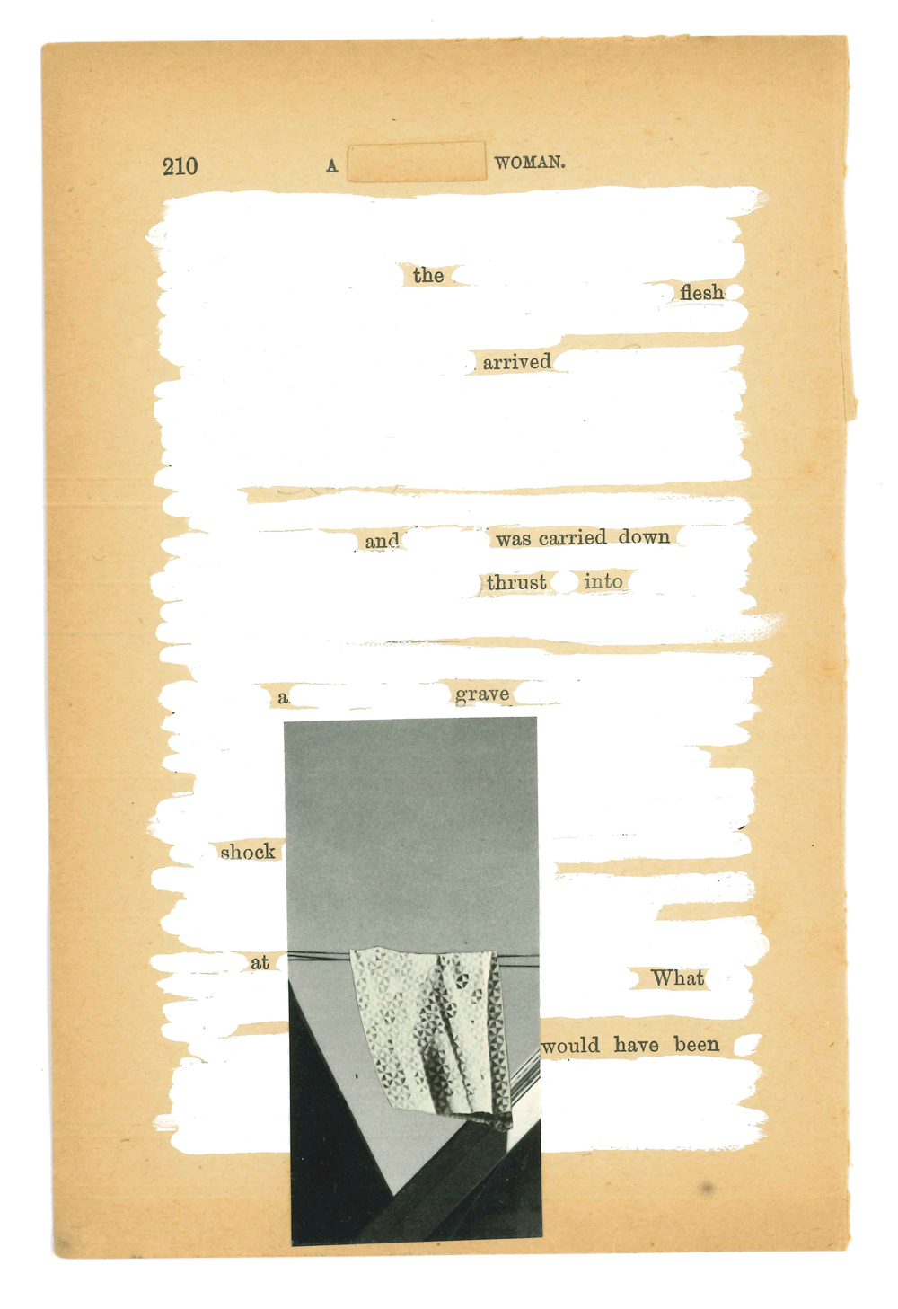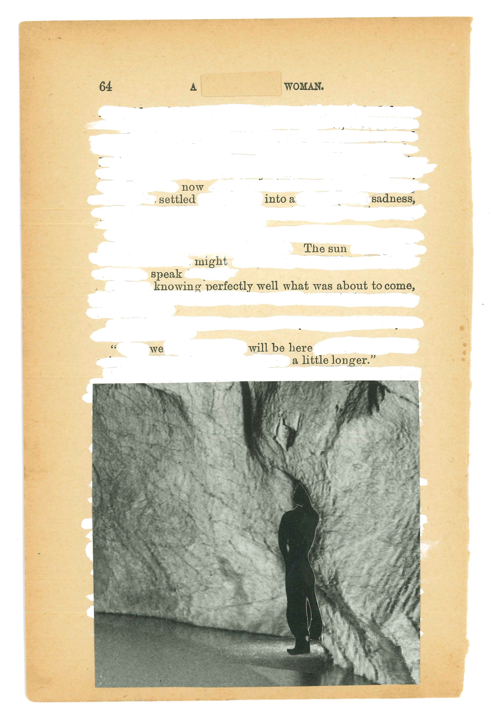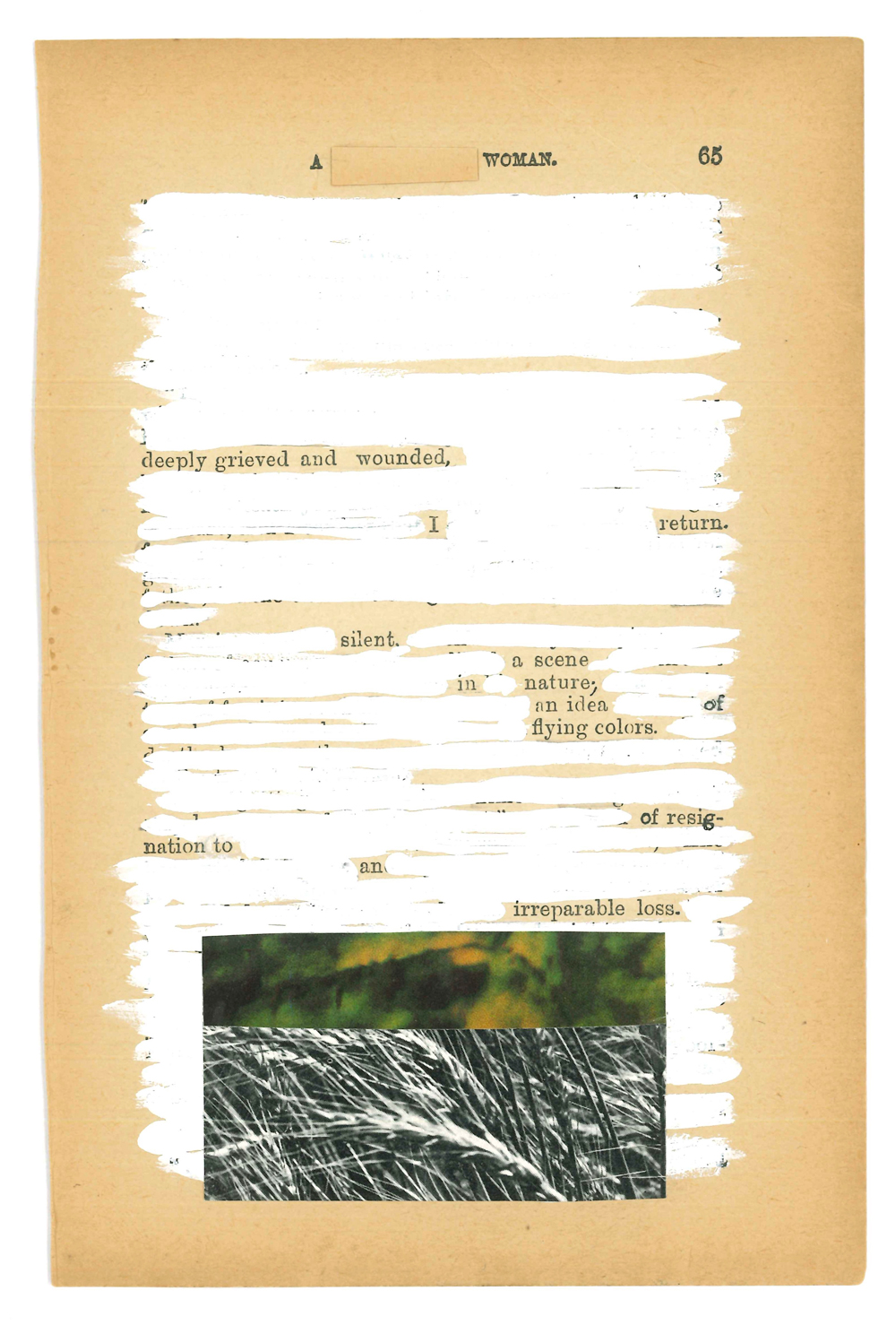 In 2024, I began using erasure as a means to find words to express my grief following a profound loss. When all my words were lost, I was able to find them on pages written over 100 years ago. My current project, “A Woman/Passing Through”, blends erasure, collage, and personal essay into a nonlinear work of literary art.