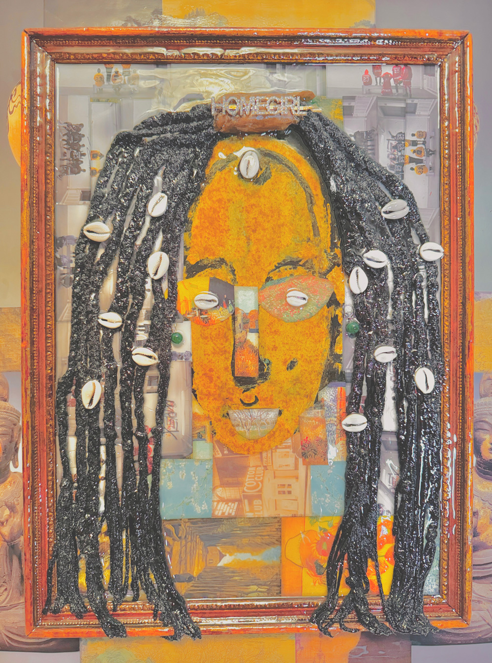Homegirl 24″x18″; 3D collage, mixed media on wooden canvas with resin finish; 2023. Courtesy of the artist.