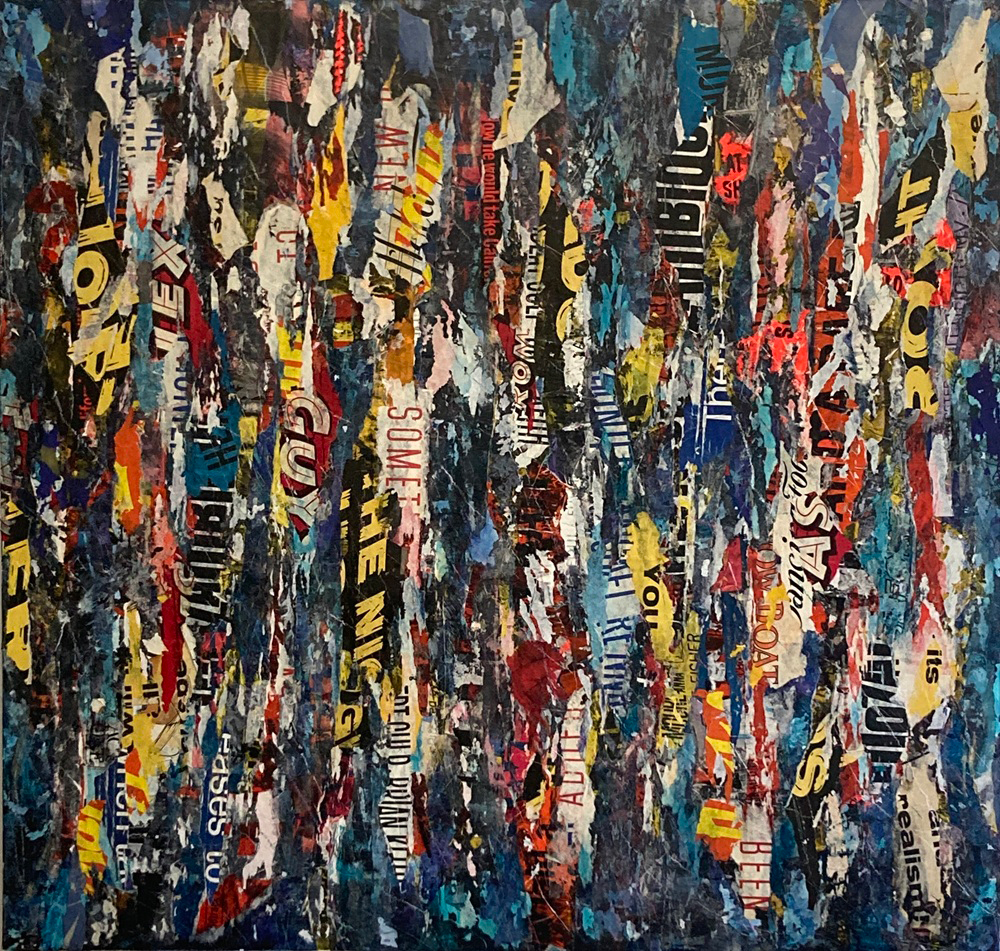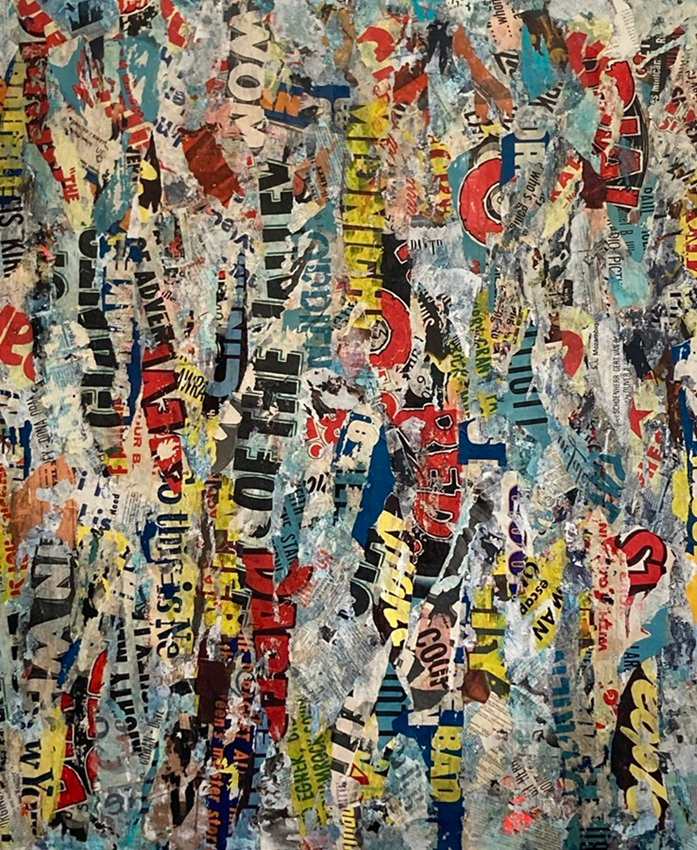 Urban Soliloquy 23 54″x46″; vintage papers, acrylic, and oil stick on canvas; 2025