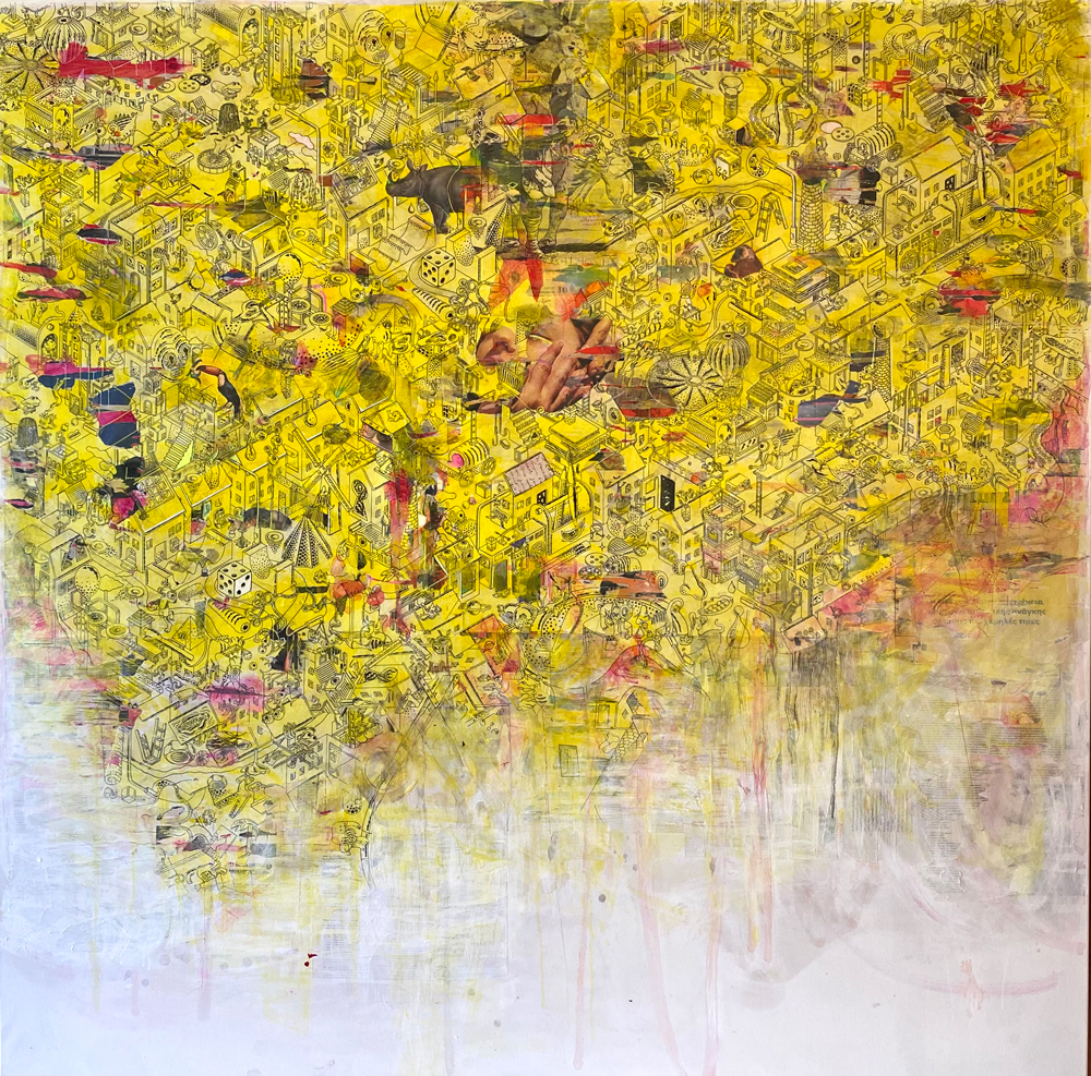 59″x59″; painting and collage on canvas; 2025. Courtesy of the artist.