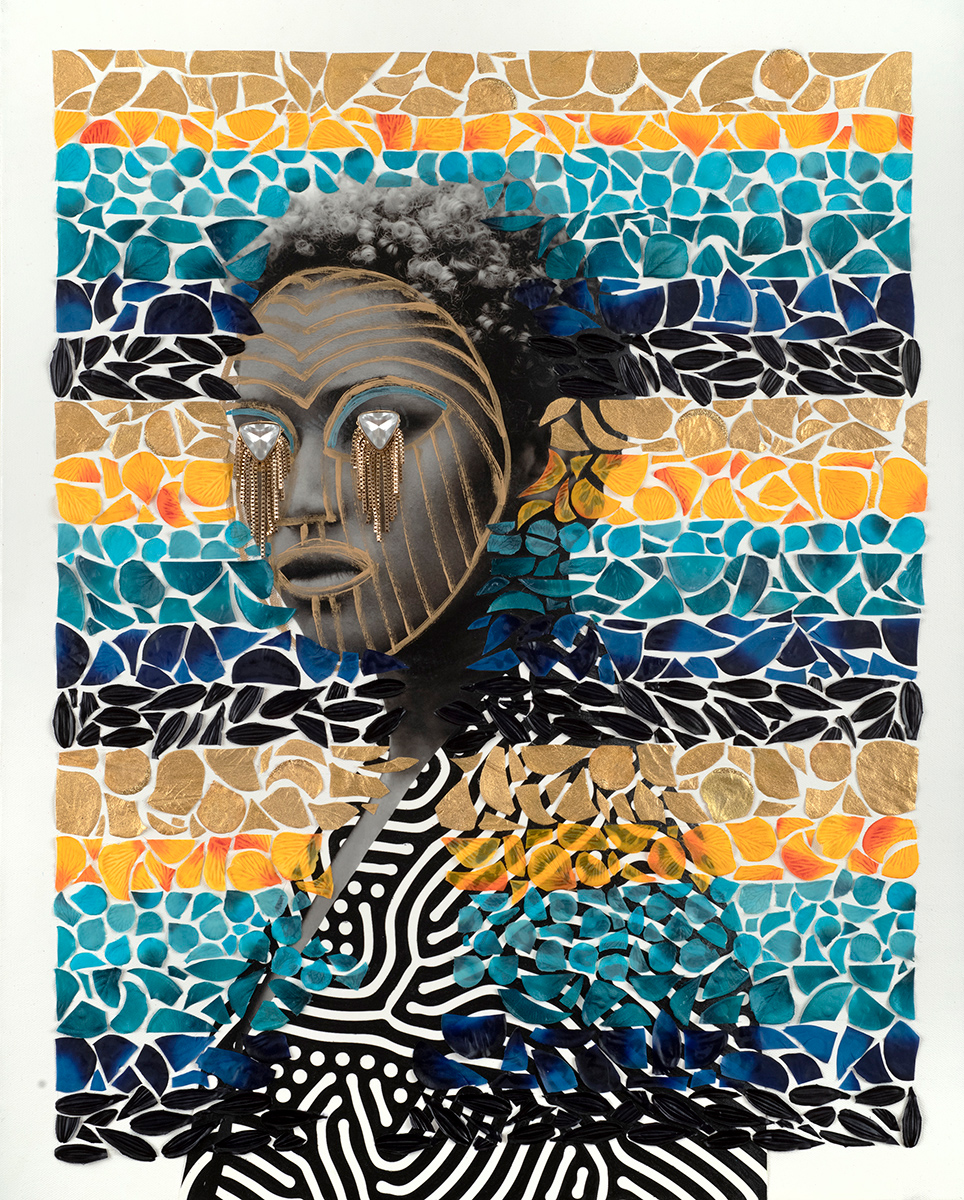 Rashad Ali Muhammad explores the liminal spaces between the physical and spiritual worlds, tracing how ancestral knowledge endures and transforms across time and geography. He invites viewers to consider what it means to reconnect with “lost” African spiritual practices that manifest in African American experiences and are reshaped by displacement, memory, and creativity. Muhammad’s mixed media collages, sculptural masks, and immersive installation evoke the unseen energies that flow between realms. Inspired by travels to West Africa and a voodoo ceremony witnessed in the floating village of Ganvié, Benin, the work interprets ritual as a portal for connection, healing, and empowerment.