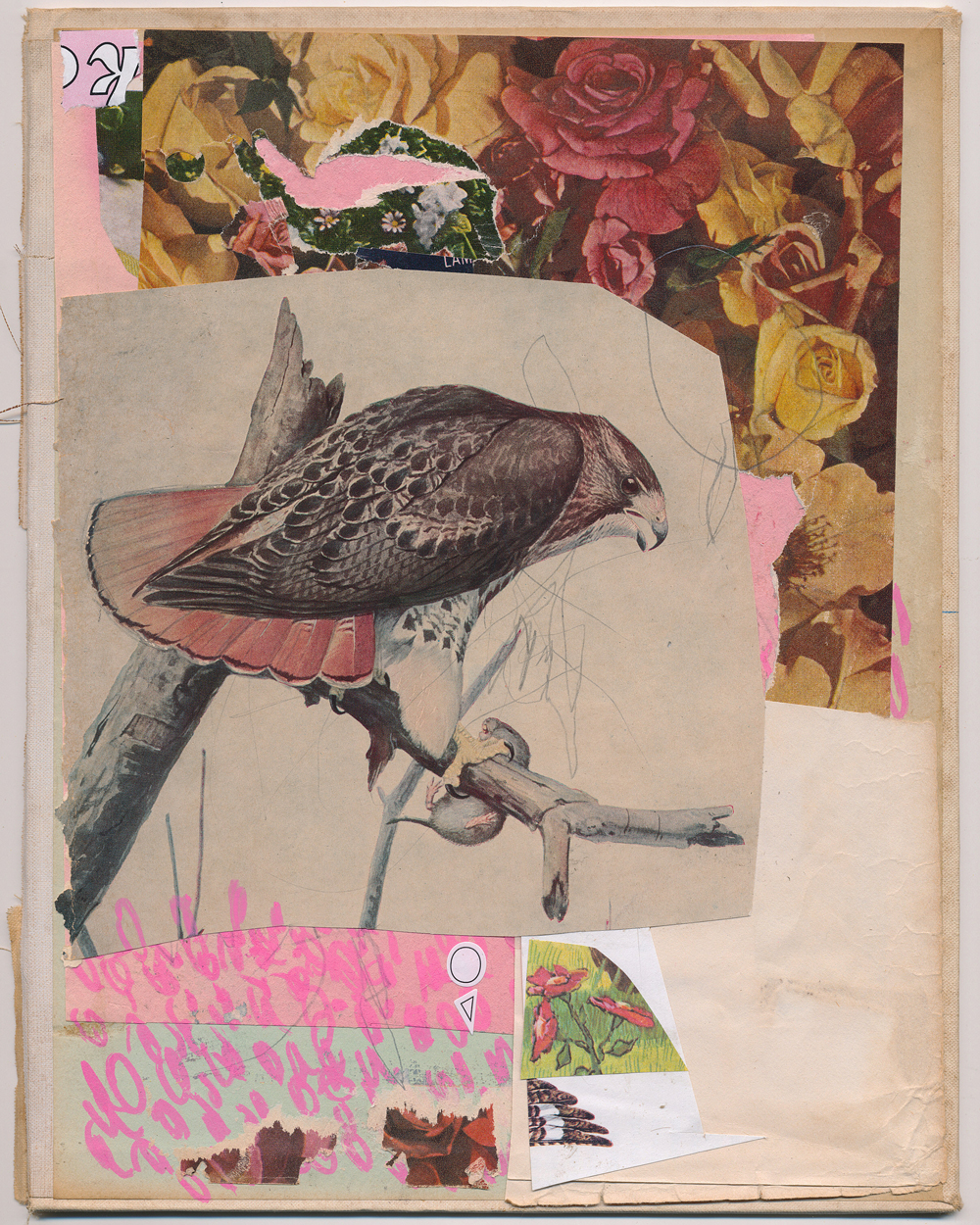 9.75″x7.75″; book cover, paper, UHU glue, posca pens, pencil; 2025. Courtesy of the artist.