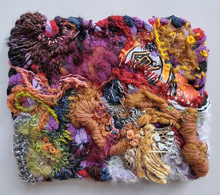 4″x5″; cotton loom loop, wool, cotton floss, metal scrap and food packaging; 2022. Courtesy of the artist.