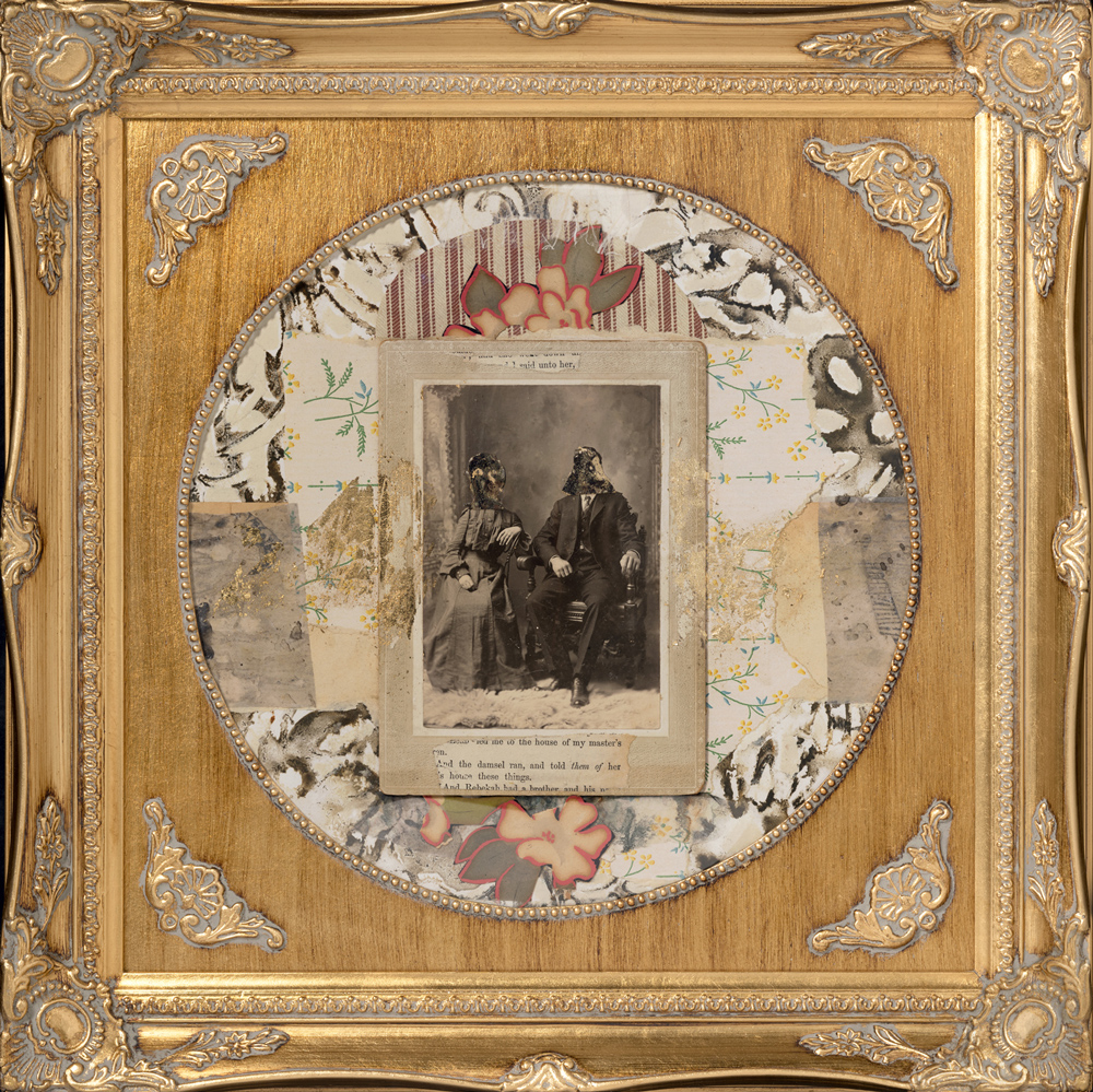 18″x18″x2″; deconstructed monoprint, found gold frame, vintage cabinet cards, gold leaf, dyed wax paper; 2024. Courtesy of the artists.