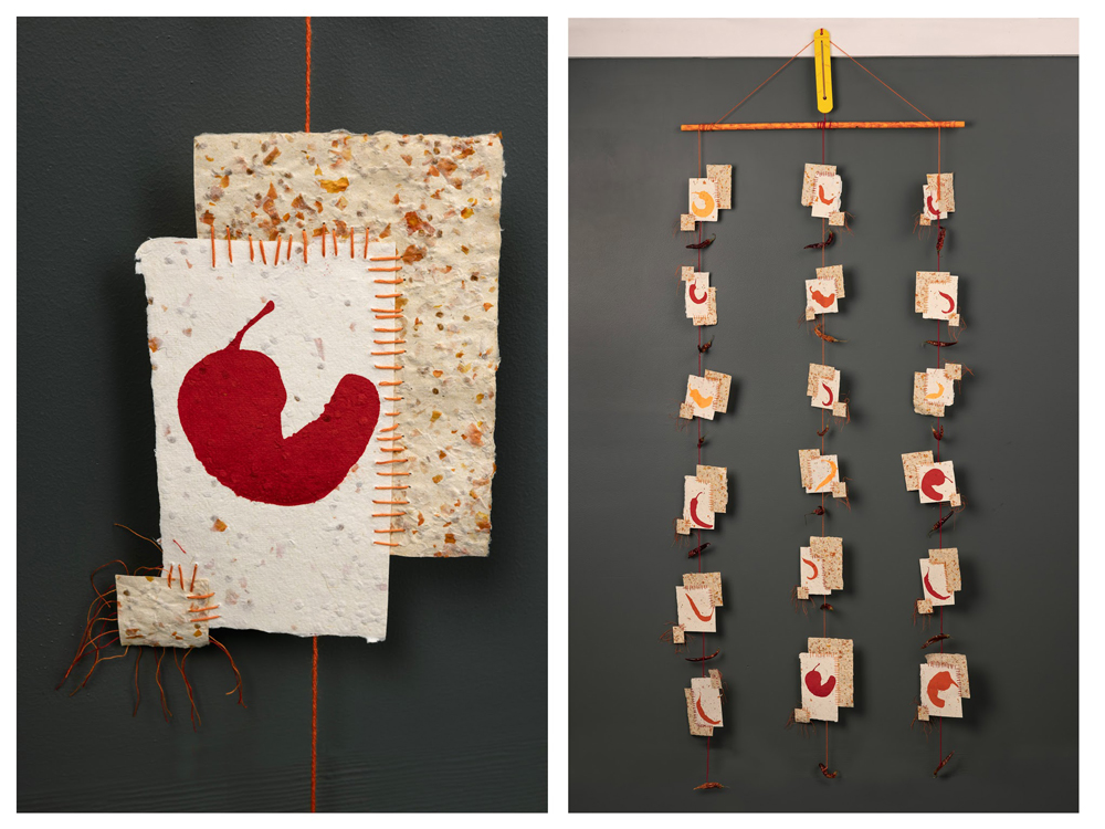 108″x36″x1″; handmade paper (peppers, cotton, and abaca), screen printing, thread, yard, wood, ink, and a thermometer; 2023. Courtesy of the artist.